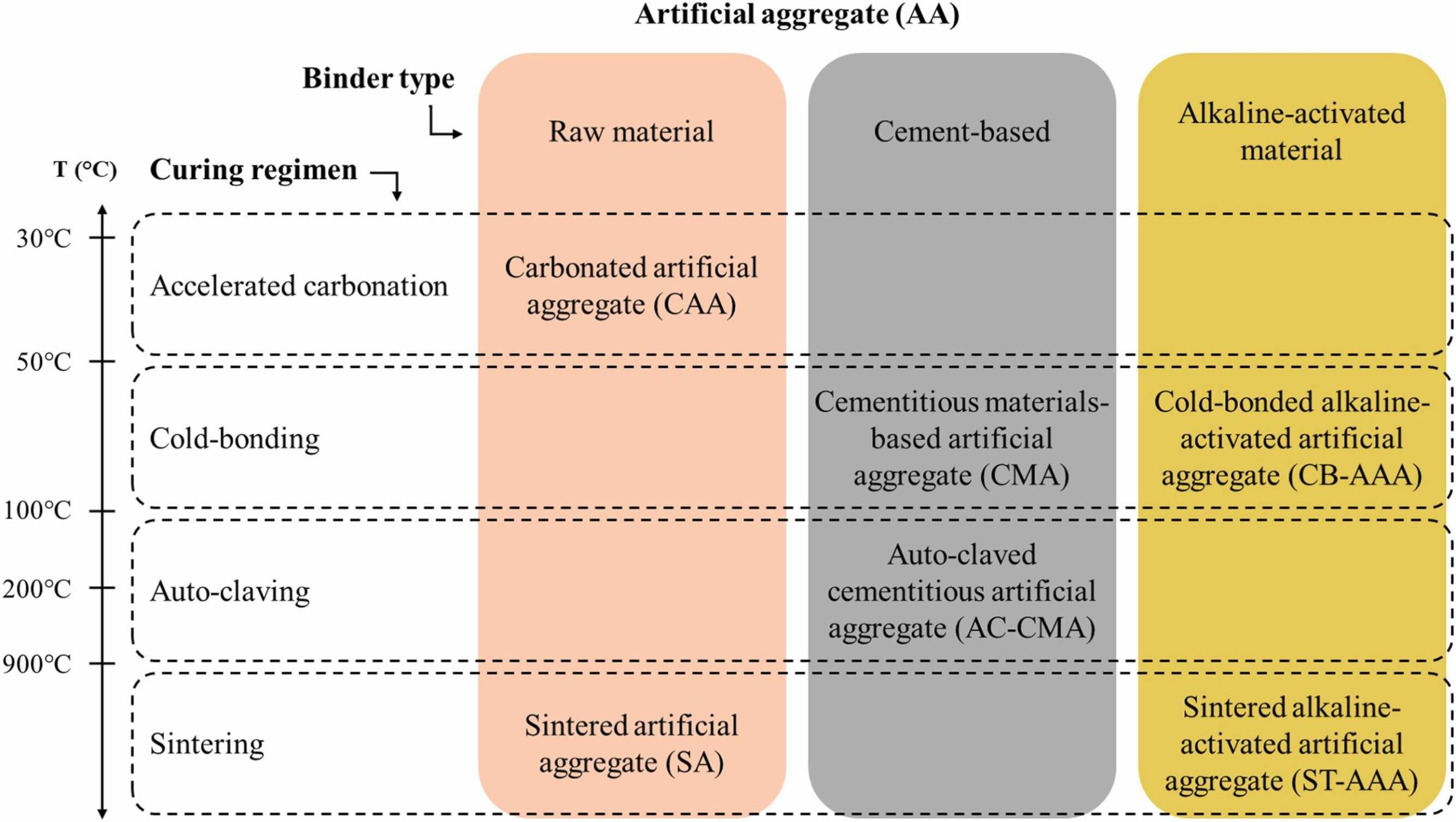 This study explores the production and performance of cold-bonded alkali-activated artificial aggregates (CB-AAA) made from highly crystalline iron tailings, a low-reactivity mining by-product. A factorial experimental design was used to assess the influence of five key parameters on crushing strength: aggregate particle size, alkaline activator molarity, co-activator dosage, curing temperature, and curing time. The resulting aggregates exhibited bulk densities from 824 to 1002 kg/m³ , water absorption between 14.78 % and 25.68 %, and crushing strengths ranging from 0.18 to 3.24 MPa. A second-order polynomial regression model was developed and validated, identifying curing temperature as the most significant factor. To evaluate structural applicability, concrete specimens were prepared with 30 % and 100 % replacement of natural coarse aggregates. Higher-quality CB-AAA mitigated compressive strength losses, with partial replacement mixtures retaining up to 60 % of the reference strength. These results demonstrate the feasibility of using iron tailings in low-carbon construction materials despite the low reactivity of these waste materials, and they offer new insights into the role of mixture design and processing conditions in optimizing the performance of CB-AAA for concrete applications.