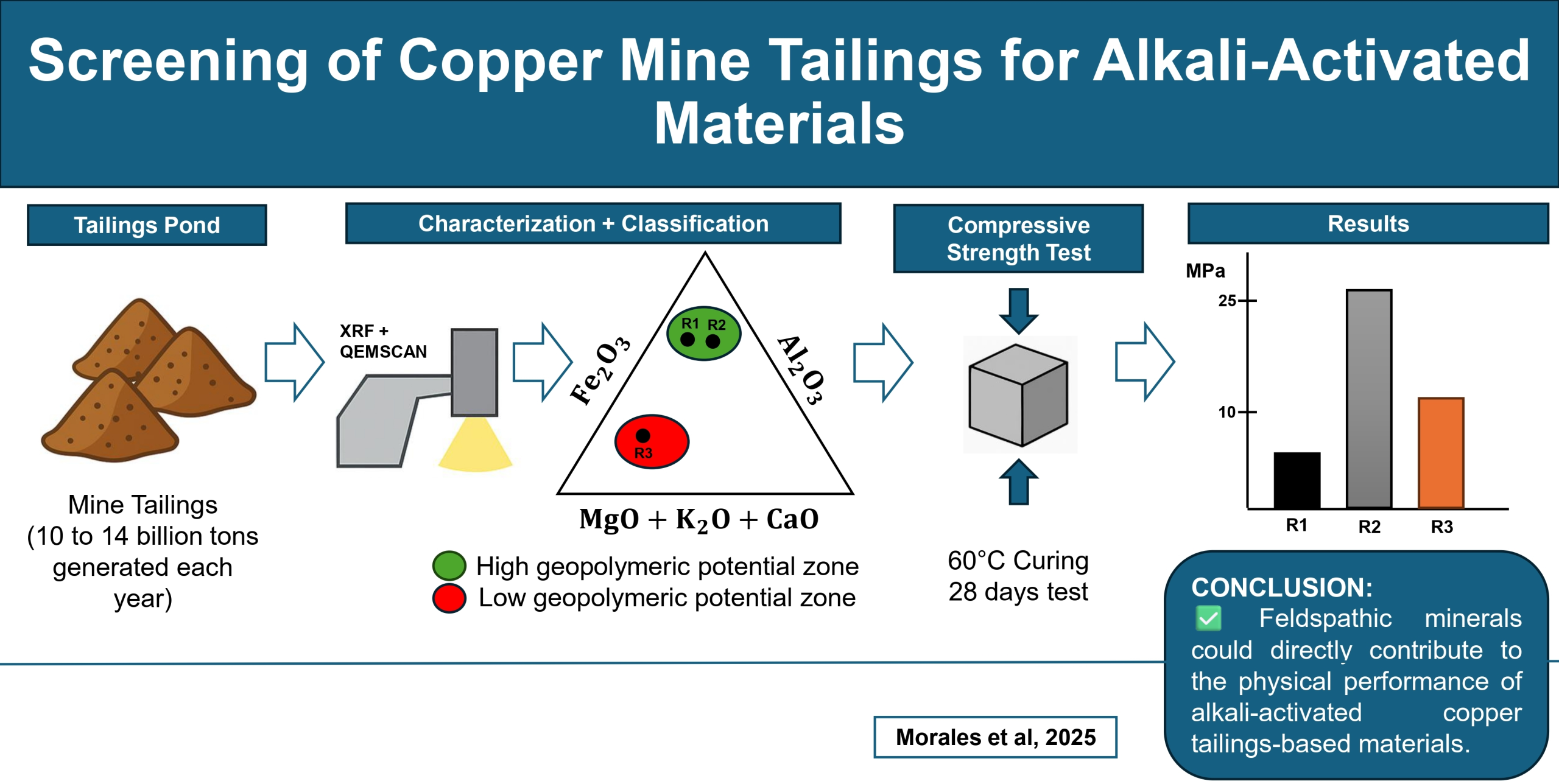 This research presents a novel methodology to classify copper tailings according to their potential as alkali-activated materials (AAMs) for construction applications. The methodology includes geochemical and mineralogical characterization via QEMSCAN and X-ray fluorescence, with mechanical performance evaluation through compressive strength test (UCS). A three-phase diagram based on Al2O3, Fe2O3, and CaO-MgO-K2O is proposed for a fast screening of copper tailing potential to be used as a construction material. In this paper, three copper tailings were chosen to test the methodology, and a set of five samples for each tailing have been geopolymerized for testing. Copper tailing samples were mixed with 0, 2.5, 5, 7.5 and 10% by mass of Ordinary Portland Cement (OPC) to evaluate the effect on performance when a chemical co-activator is used to improve material reactivity. Compressive strength testing was applied on 2 cm3 cubes after 28 days of curing at 60 °C, yielding values from 6 to 26.1 MPa. The best performing sample featured a Si/Al ≅ 3 ratio and a mineralogy with significant presence of reactive species such as plagioclase and K-feldspar (≅42%). In contrast, high levels of Fe2O3 (≥12%), clay (≥7%), and pyrite (≥4%) were associated with reduced mechanical performance.